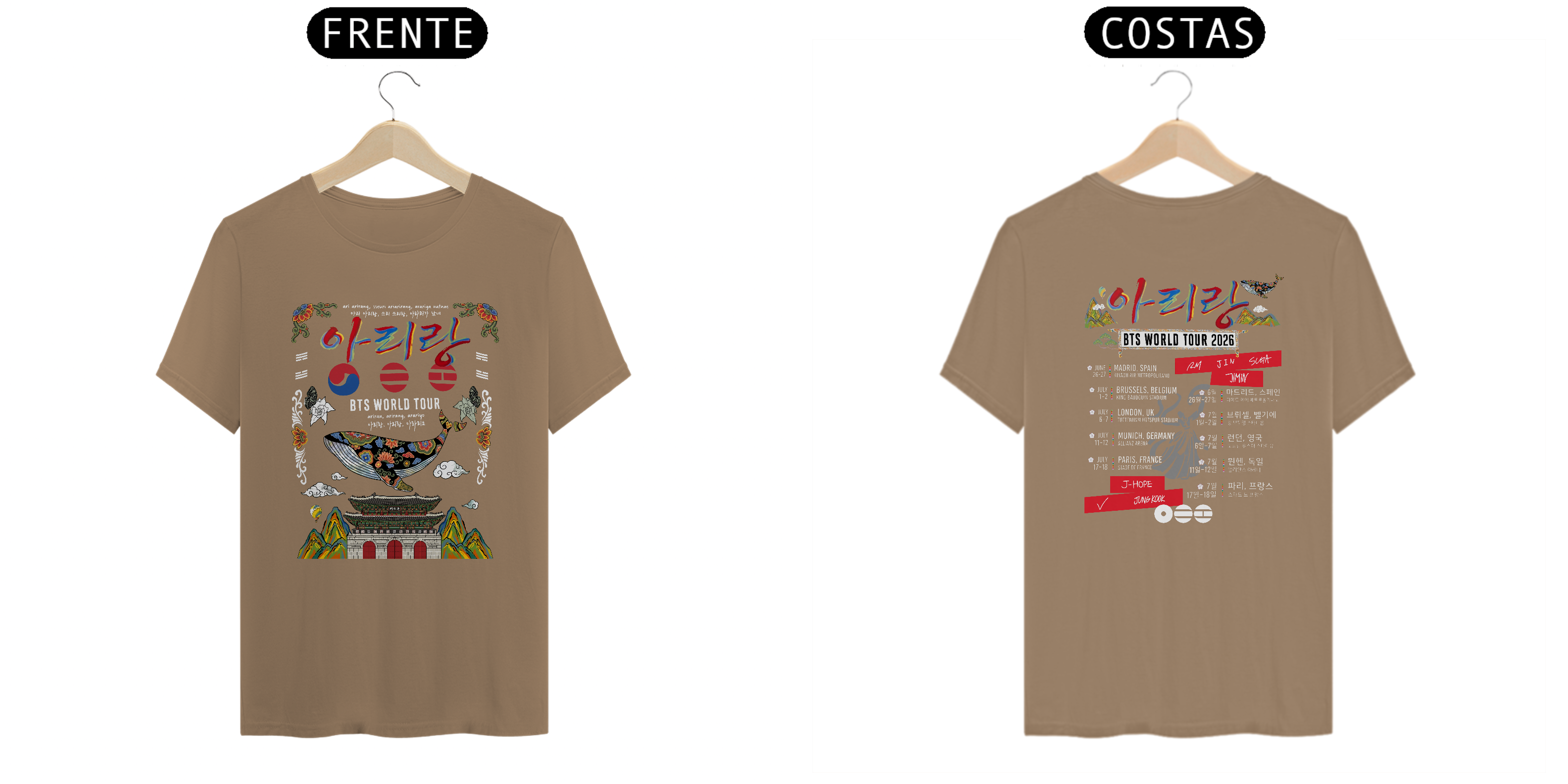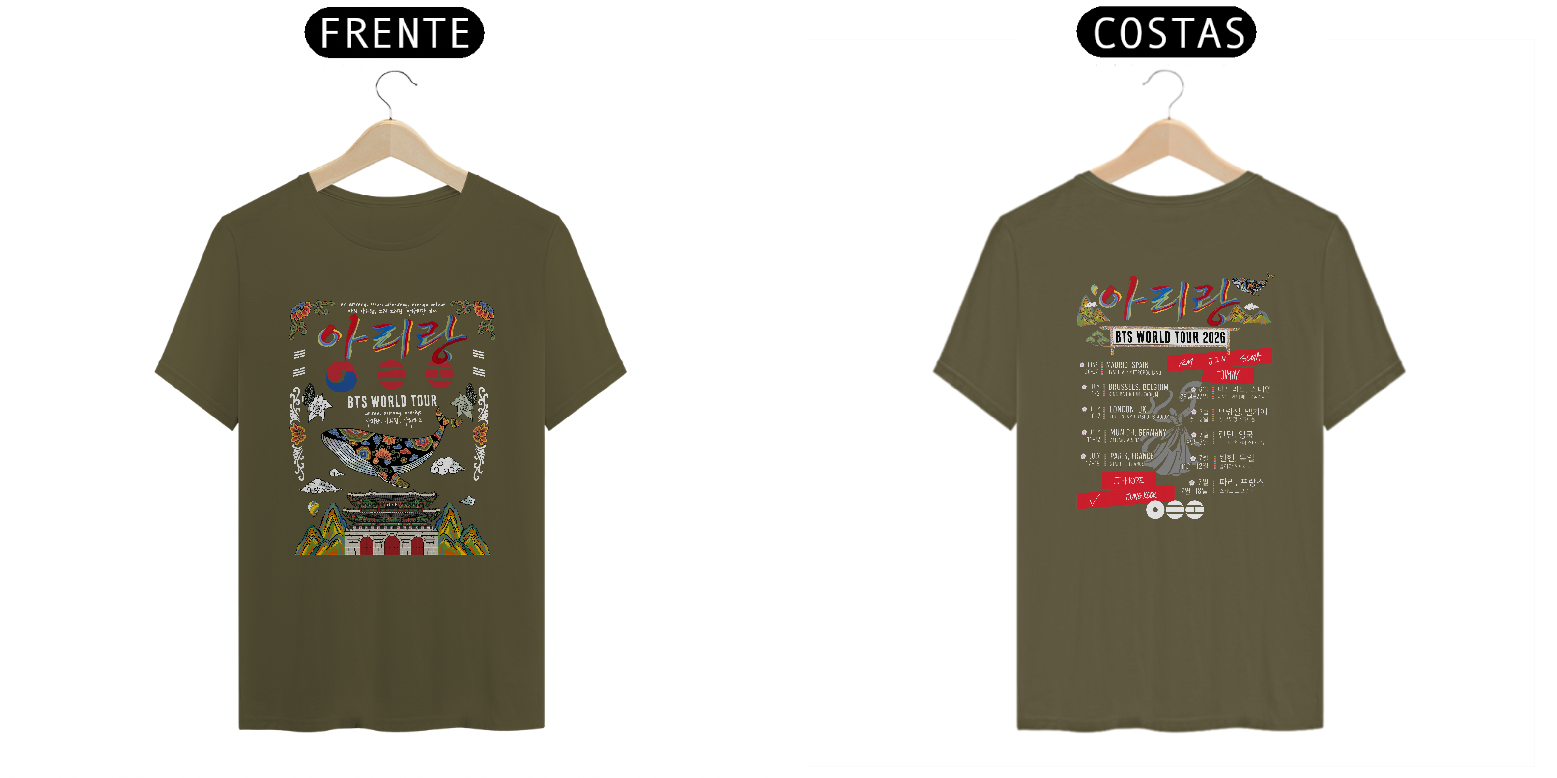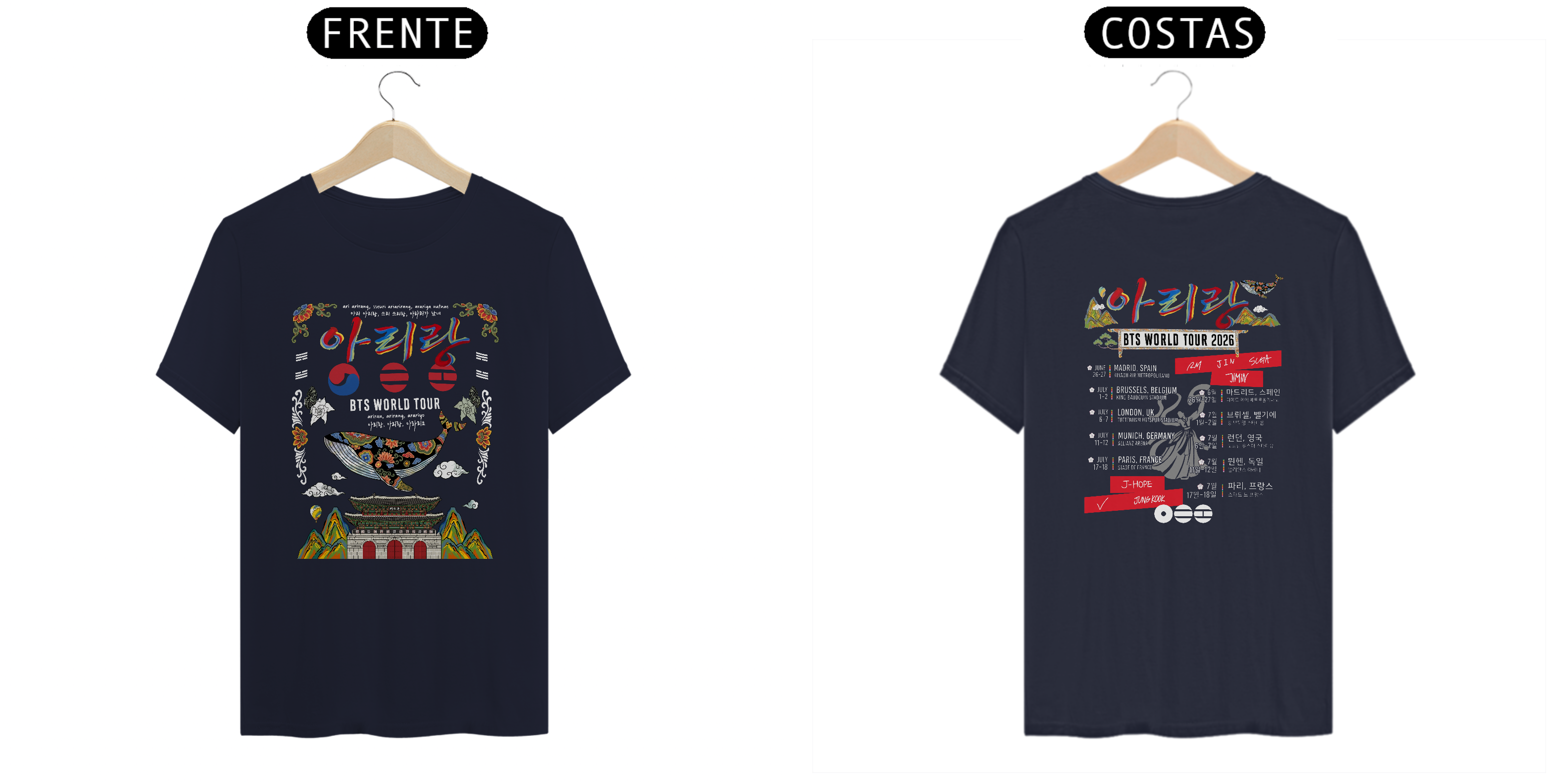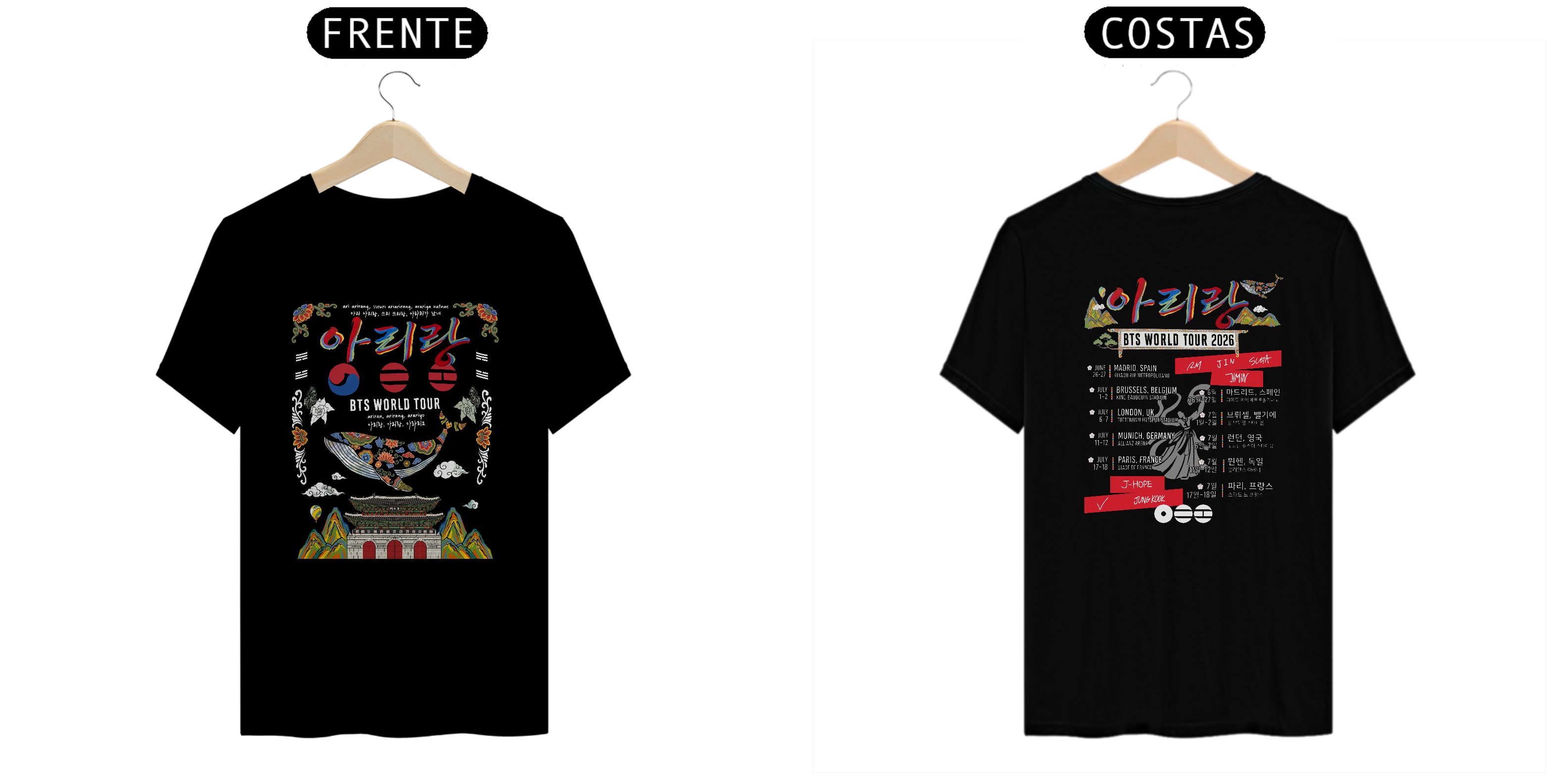 Celebre a música e a cultura coreana com esta camiseta inspirada na arte tradicional dos palácios e na canção icônica 아리랑. Com design exclusivo que mistura caligrafia coreana, elementos arquitetônicos e padrões culturais, essa estampa é perfeita para quem ama moda com significado.